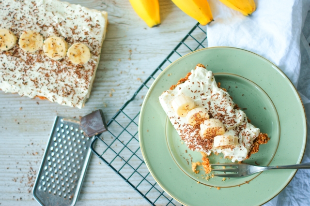 - Na wystudzony spód wyłożyć krem daktylowy. Na kremie ułożyć plastry bananów (ok. 3-4 mm grubości). Na banany wyłożyć bitą śmietanę.