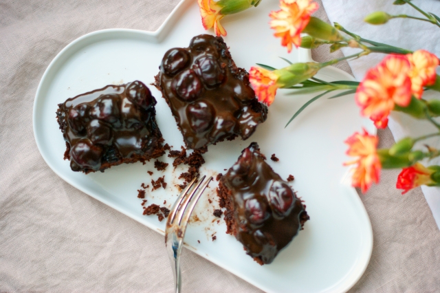 9. Na zimne brownie wylać polewę czekoladową z wiśniami. Wstawić do lodówki na min. godzinę.