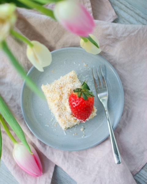 - Wierzch ciasta udekorować truskawkami i posypać uprażonymi wiórkami kokosowymi. Ciasto odstawić na kilka godzin do lodówki.