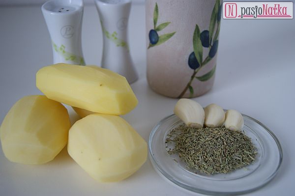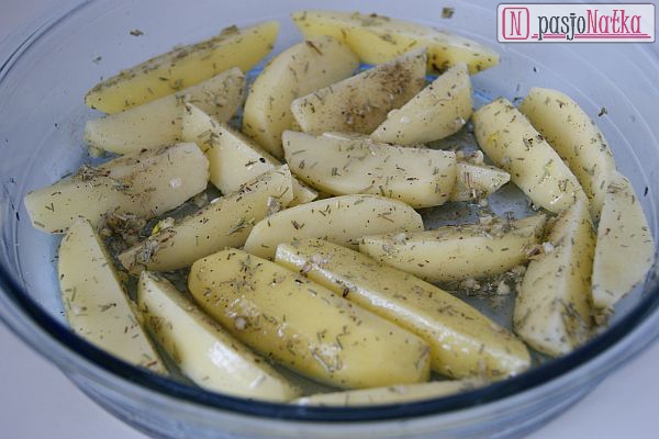 Na dno naczynia żaroodpornego dałam oliwę, na to obrane ziemniaki pokrojone w „półksiężyce”, posiekany czosnek, rozmaryn, sól i pieprz. Całość dokładnie wymieszałam i piekłam 45 minut w piekarniku nagrzanym do 200 stopni C od czasu do czasu mieszając, żeby ziemniaki nie przywarły do dna.