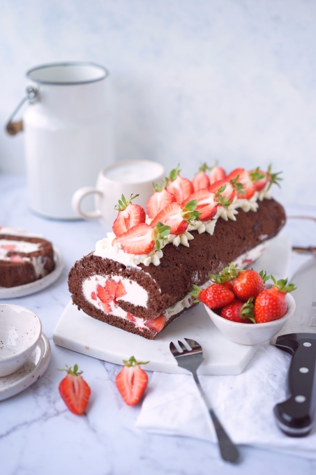 Czekoladowa rolada z bitą śmietaną i truskawkami