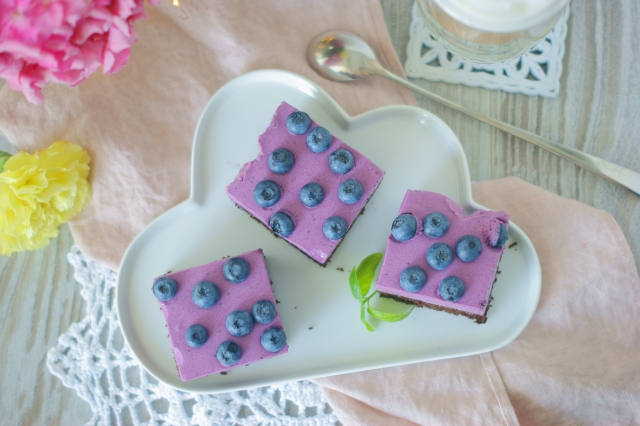 - Zimny spód czekoladowy nasączyć wodą wymieszaną z sokiem z cytryny. Na spód wylać tężejącą piankę. Górę ozdobić borówkami.