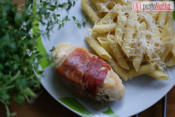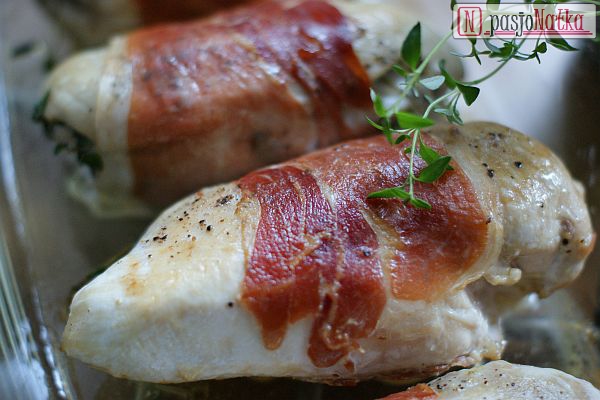 Oczyszczone filety z kurczaka nacięłam wzdłuż tak, by powstały kieszonki. Mięso natarłam solą i pieprzem, a do kieszonek włożyłam po 2 gałązki tymianku. Tak przygotowane filety owijałam szynką parmeńską i podsmażałam na rozgrzanej oliwie po około 2-3 minuty z każdej strony, po czym zapiekałam je w piekarniku nagrzanym do 170 stopni przez około 30 minut.
