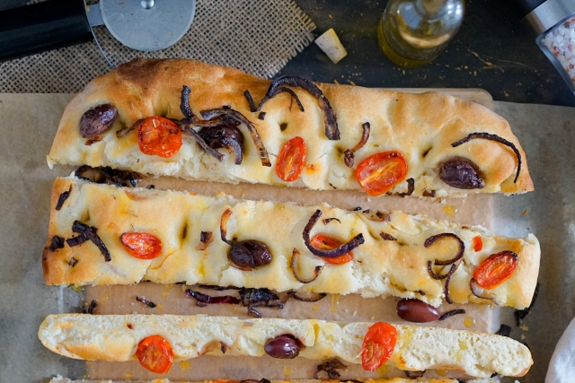 Dziś pomysł na przepyszny lunch – focaccia z pomidorami, oliwkami, czerwoną cebulą i rozmarynem. Jest przepyszna 🙂