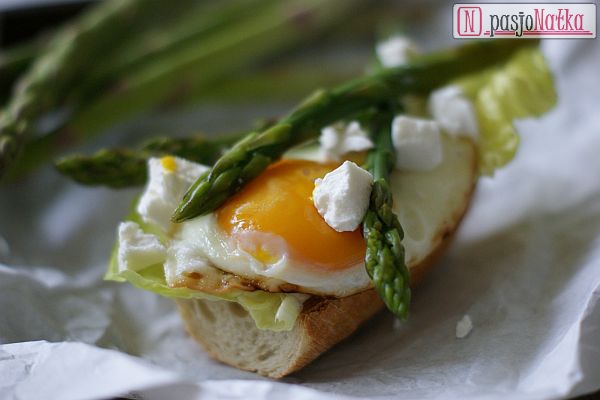 Na chrupiącą bagietkę wyłożyłam sałatę, jajka sadzone, szparagi i kawałki koziego sera.