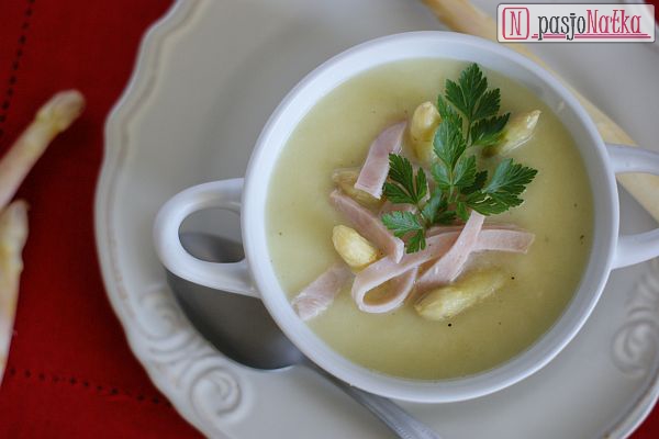 Gotowy krem podawałam z szynką i ugotowanymi główkami szparagów.