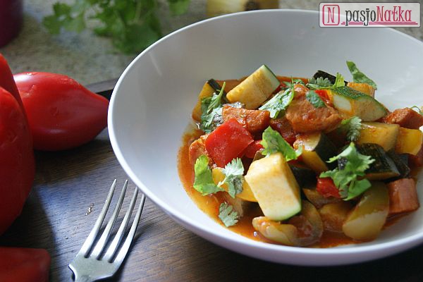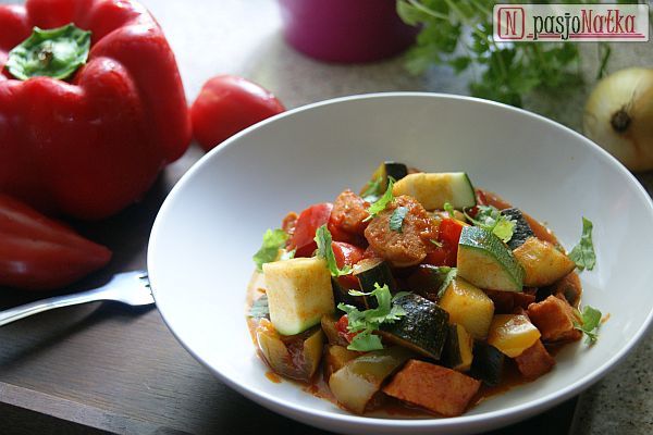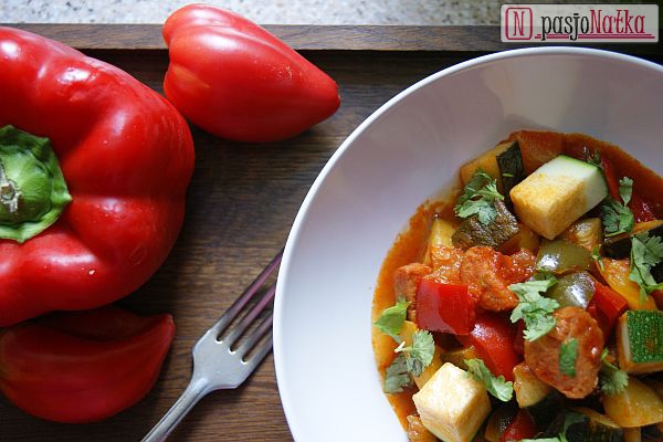 Cebulę pokroiłam w kostkę i podsmażyłam na niewielkiej ilości oliwy. Do cebuli dodałam pokrojoną w kostkę kiełbasę i całość smażyłam na złoty kolor. Następnie na patelnię dorzuciłam pokrojone w dużą kostkę (2 x 3 cm) warzywa – cukinię i kolorowe papryki. Całość dusiłam pod przykryciem około 15 minut.