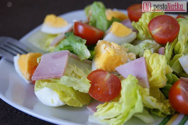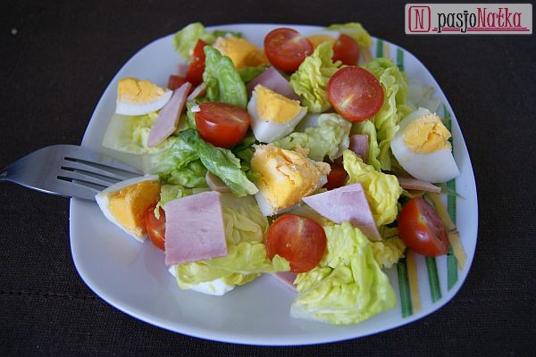 Opcjonalnie można dodać szczypiorek i ogórka. Sałatkę polałam sosem jogurtowym (4 łyżki jogurtu naturalnego + 1 łyżka majonezu, sól i pieprz). Proste, pyszne i zdrowe! Voilà!