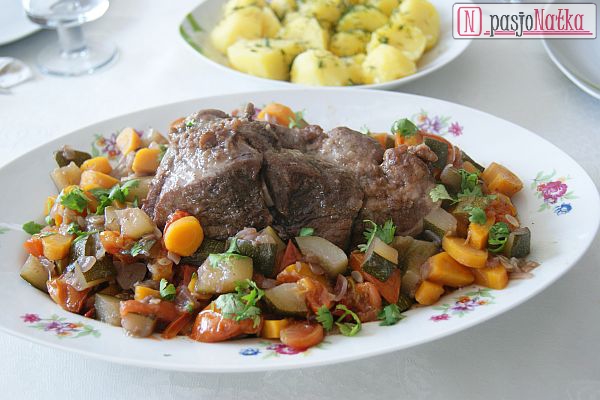 Gotową łopatkę z warzywami podawałam z młodymi ziemniaczkami posypanymi koperkiem.