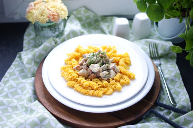 - Podawać z ugotowanym makaronem (u mnie bezglutenowy) i świeżym koperkiem.