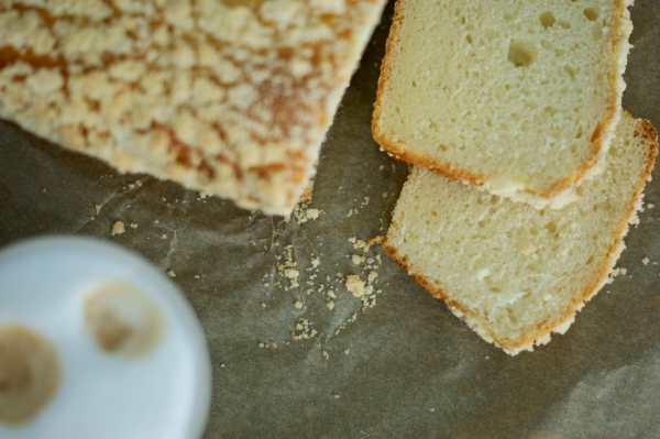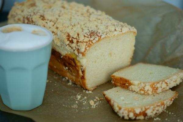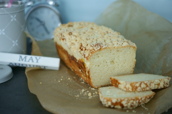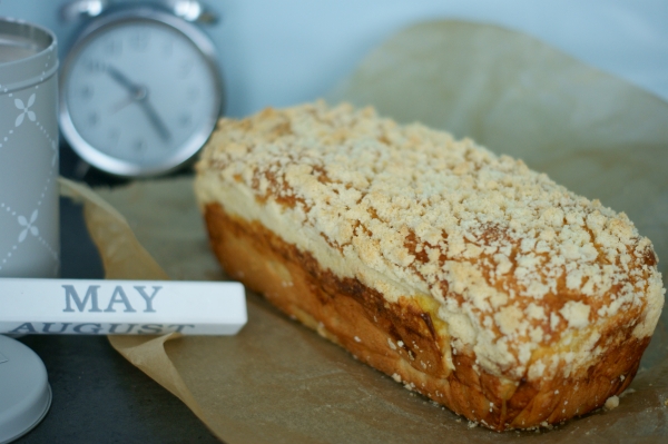 Wyrośnięte ciasto przełożyłam do keksówki wyścielonej papierem do pieczenia, posmarowałam jajkiem i posypałam kruszonką (składniki na kruszonkę roztarłam w palcach). Całość ponownie odstawiłam na 30 minut do wyrośnięcia.