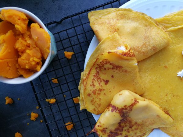 Niepozorną dynię hokkaido piekłam godzinę w 200°C, po czym wydrążyłam cudownie pomarańczowy i gęsty miąższ. Otrzymane puree ostudziłam i zabrałam się za przygotowanie naleśników.