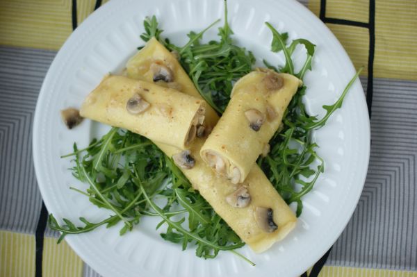 - Na jeszcze ciepłe naleśniki nakładać gorący farsz. Naleśniki zwijać w rulony i układać na rukoli.