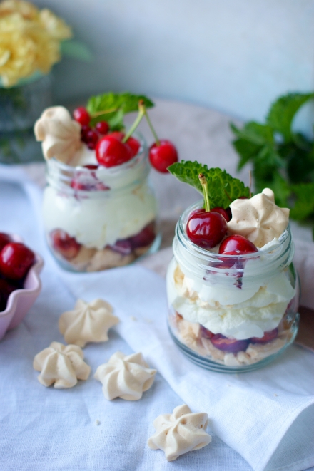 - Wierzch deseru ozdobić całymi bezikami, czereśniami, porzeczkami i listkami mięty.