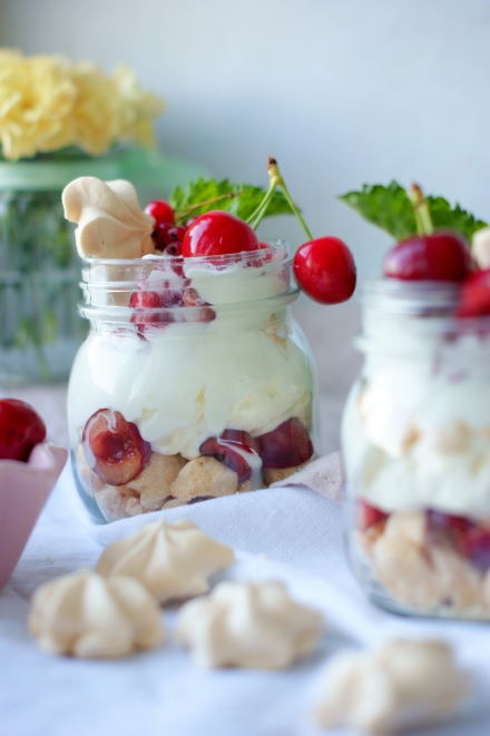 - Na bitą śmietanę pokruszyć po 2 bezy, przykryć łyżką bitej śmietany.
