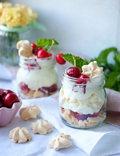 - Umyte czereśnie przekroić na połówki, wydrążyć pestki. Na pokruszone bezy wyłożyć po 10-12 połówek czereśni.