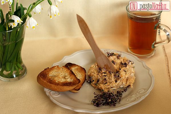 Pasta najlepiej smakuje na świeżo upieczonej lub podpieczonej bagietce posmarowanej masłem.