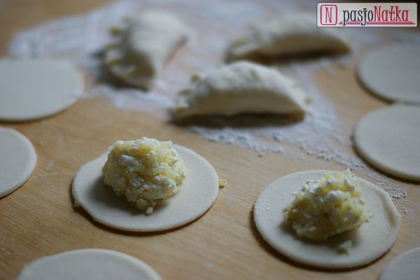 Ciasto na pierogi dzielę na mniejsze części. Każdą część rozwałkowuję na podsypanej mąką stolnicy na grubość około 2 mm, a następnie szklanką wykrawam krążki ciasta. Na każdy krążek nakładam małą łyżeczkę farszu i dokładnie sklejam pierogi. Gotowe pierogi odkładam na czystą ściereczkę bądź blat posypany mąką.