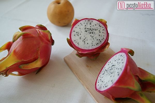 1Pitaja nazywana jest truskawkową gruszką. Szczerze powiem, że nie wiem skąd takie porównanie, bo według mnie ani z gruszką ani z truskawkami nie ma wiele wspólnego. Konsystencja przypomina kiwi (ze względu na obecność czarnych pesteczek), a smak bardziej melona, choć jest mniej wyrazisty i trochę mdły.