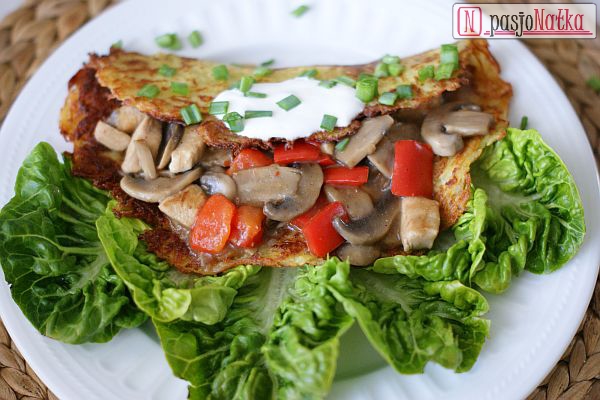 Placki układałam na płaskich talerzach. Na połowę każdego placka nakładałam gulasz i przykrywałam drugą połową. Placki podawałam z kleksem śmietany i szczypiorkiem.