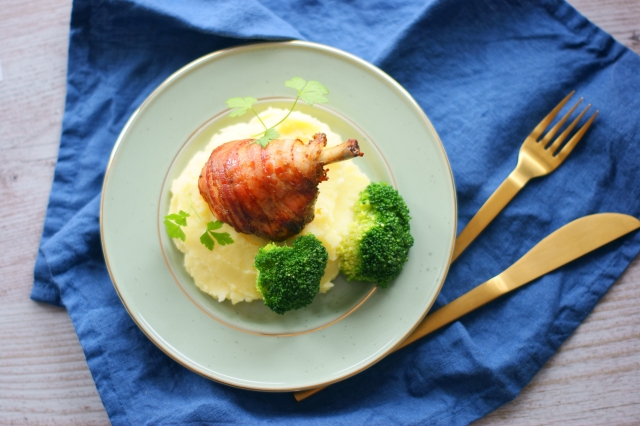 Mam dla Was pyszny pomysł na obiad – podudzia z kurczaka zapiekane w boczku. Potrzebujecie do tego tylko kilka składników, a zachwycicie domowników i gości 😉 Tak przygotowane mięso jest soczyste i bardzo aromatyczne.