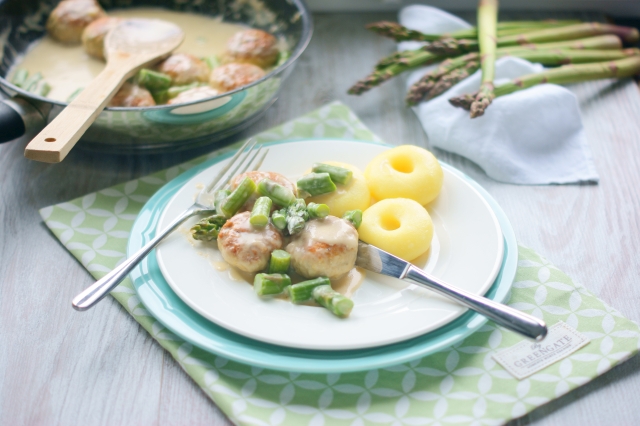 - Do sosu z pulpetami dodać ugotowane szparagi. Zagotować.