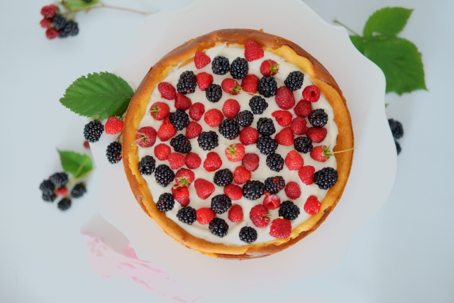 Dużo słodyczy u mnie ostatnio 🙂 Dziś kolejny sernik – tym razem z serem, a nawet dwoma – z twarogiem i mascarpone. Do tego garść malin i jeżyn. To wszystko razem tworzy idealnie puszyste i słodkie połączenie. Pychota!