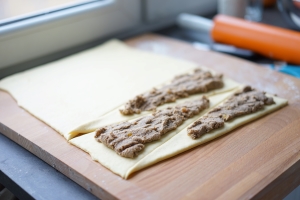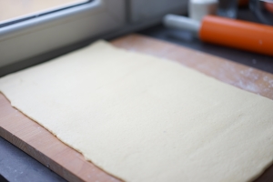 - Na oprószonej mąką stolnicy umieścić ciasto półfrancuskie i rozwałkować go w prostokąt o grubości ok. 0,5-0,7 mm.