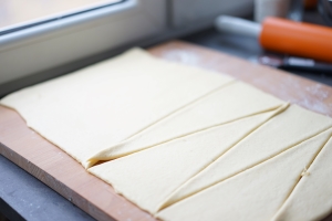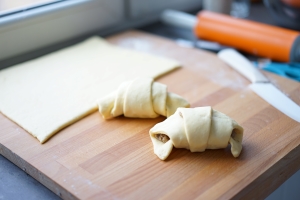 - Ciasto półfrancuskie wyjąć z lodówki na ok. 20 minut przed robieniem rogali.