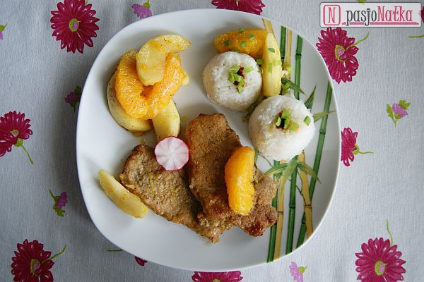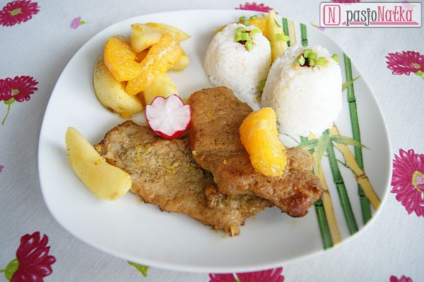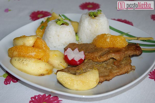 Jabłka i pomarańcze obrałam i pokroiłam (jabłka w ósemki, a pomarańcze podzieliłam na cząstki i usunęłam białe części). Na patelni rozgrzałam oliwę, wrzuciłam jabłka i podsmażyłam na złoty kolor. Następnie dodałam miód i odczekałam chwilę aż się skarmelizuje. Na koniec dodałam kawałki pomarańczy i całość lekko oprószyłam solą i pieprzem. Sos chwilę dusiłam (około 3-4 minut). Jabłka i pomarańcze posłużyły mi jako „surówka”, a otrzymanym sosem polałam upieczony schab. Danie podałam z białym ryżem. Voilà!