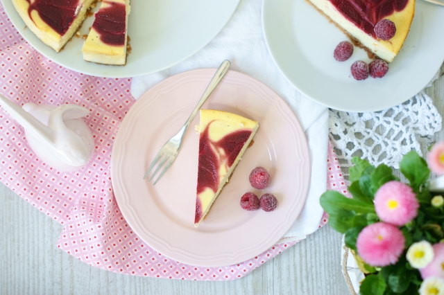 - Na powierzchnię sera wykładać po łyżeczce musu malinowego (delikatnie „kłaść” mus na powierzchni). Wykałaczką delikatnie rozmieszać mus po powierzchni ciasta rysując kilkanaście ósemek.