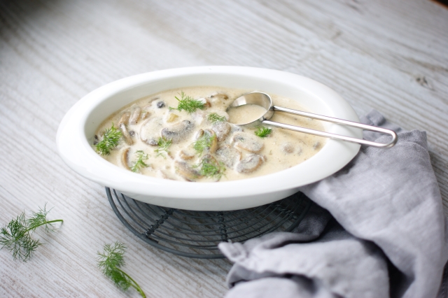 - Śmietanę wymieszać z mąką – wylać na patelnię – dokładnie wymieszać i zagotować.