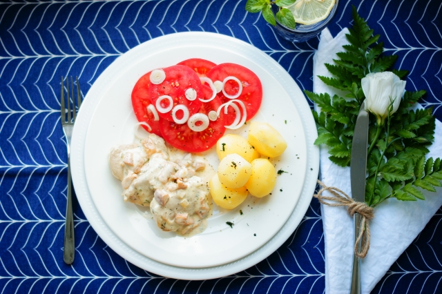 Dziś kolejny pomysł na sos kurkowy – tym razem w połączeniu z młodymi ziemniakami, sałatką z pomidorów i polędwiczkami wieprzowymi.