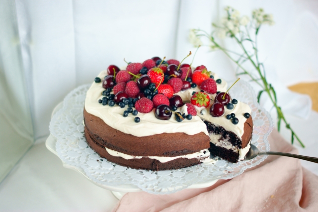Tort czekoladowy z owocami i kremem śmietanowym (bez glutenu)