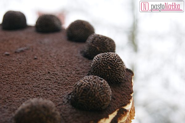 3/4 masy dałam na drugiego biszkopta,resztę wyłożyłam na górną warstwę. Całość posypałam kakao i ozdobiłam cukierkami rumowymi. Voilà.