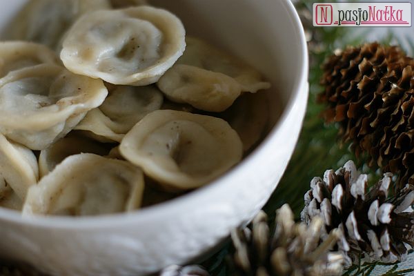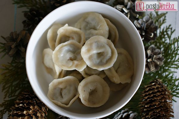 Z przygotowanego ciasta niedużą literatką wykrawam kółka, wypełniam je farszem i lepię małe pierożki, a następnie sklejam ich rożki i formuję zgrabne uszka.