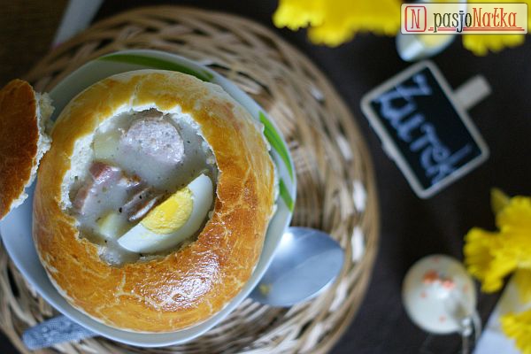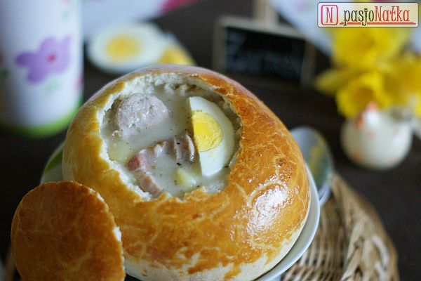 Gorący żurek wlałam do miseczek chlebowych i podałam z ugotowanym jajkiem.